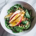 A refreshing and vibrant Apple Spinach Salad tossed with a tangy honey-mustard lemon dressing. This quick and easy salad combines fresh spinach, crisp apples, crunchy nuts, and optional creamy cheese, perfect as a light lunch or side dish.