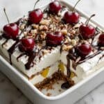 - Top with nuts and fruit: Sprinkle chopped walnuts or pecans evenly on top along with the optional chopped strawberries or maraschino cherries, if using. Drizzle chocolate syrup over the entire cake as a decorative and flavorful finish.