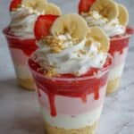 These Banana Strawberry Pudding Cheesecake Cups combine a crunchy graham cracker crust with a creamy banana pudding cheesecake filling, topped with fresh strawberries and whipped cream. Perfect as an easy no-bake dessert that sets in the refrigerator, offering a delightful blend of fruity flavors and rich textures.