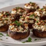 These festive Christmas stuffed mushrooms are a delicious appetizer featuring a savory blend of cream cheese, garlic, herbs, Parmesan, and breadcrumbs baked to golden perfection. Easy to prepare ahead of time and perfect for holiday gatherings, they offer bite-sized bursts of flavor that will delight your guests.