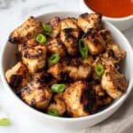 Skinless works best for bite-sized pieces to cook evenly and crisp nicely in the air fryer. If you want to use skin-on, consider removing the skin after cooking for the best texture.