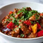 This Best Ever Pepper Steak Recipe features tender beef stew meat sautéed with bell peppers and garlic, then slow cooked with stewed tomatoes, beef broth, and Worcestershire sauce. The result is a flavorful, hearty dish perfect for a comforting meal with rich, savory notes and tender beef that melts in your mouth.