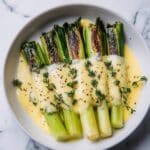 - Serve: Spoon the warm beurre blanc sauce generously over the braised leeks. Garnish with fresh herbs if desired, and serve immediately for the best texture and flavor.