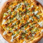 - Serve: Remove the pizza from the oven and allow it to cool slightly for a few minutes. Slice and serve with ranch or blue cheese dressing on the side, perfect for dipping or drizzling.