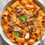 Slice your rested chicken and lay it atop the creamy, tomato-streaked rigatoni. Garnish with extra Parmesan, red pepper flakes for heat, and fresh basil leaves to finish with a burst of herbal brightness. The dish is now ready to delight lingering appetites and soaring taste buds alike.