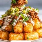 Divide the totchos into portions while they’re still hot. Serve immediately for the best experience—these totchos shine when the cheese is gooey, the tots are crispy, and the toppings are fresh and vibrant.
