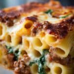 A creamy and cheesy rigatoni pasta dish featuring savory ground beef, green bell peppers, and a rich blend of mozzarella and Parmesan cheeses, all simmered in a flavorful Italian-seasoned cream sauce. Perfect for a hearty and comforting meal ready in just 30 minutes.