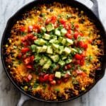 This Cheesy Chicken Burrito Skillet is a quick and flavorful one-pan meal combining tender chicken, fluffy rice, black beans, corn, and zesty diced tomatoes with green chiles, all seasoned with taco spices and topped with melted Mexican cheese. Perfect for a weeknight dinner, it’s hearty, cheesy, and packed with Tex-Mex flavors.