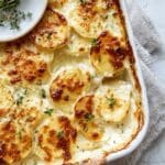 Reheat leftovers gently in a 350°F oven, covered with foil to prevent drying out. Remove the foil in the last few minutes to crisp up the top again. Alternatively, individual portions warm nicely in the microwave, but the oven method keeps that wonderful scalloped texture best.