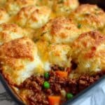 Dollop spoonfuls of the biscuit dough evenly over the casserole filling. Cut 1 tablespoon of chilled butter into tiny pieces and scatter them atop the biscuits to encourage flakiness and browning. Place the casserole in the oven and bake for about 25 minutes, until the biscuits have risen and turned a beautiful golden brown. This final step creates an irresistible contrast between the savory filling and tender cheesy topping.