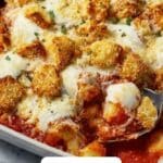 Place your dish in the oven and bake for 20 to 25 minutes, or until you see the cheese bubbling and the crumb topping turning a gorgeous golden brown. Once out of the oven, let your Chicken Parmesan Bake rest for about five minutes to set before serving — this helps everything meld together and makes it easier to slice.