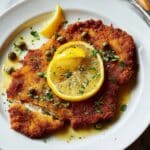 - Serve: Place each cooked chicken cutlet on a plate. Spoon the lemon-caper sauce generously over the top. Garnish with a slice of lemon and a sprinkle of fresh chopped parsley before serving.