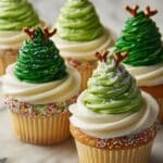 A sturdy frosting like buttercream is ideal because it holds shape well when piped, creating the distinct layers that resemble pine needles on your cupcake Christmas trees.