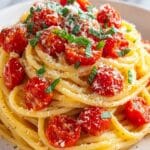 A luscious and creamy fresh tomato garlic pasta that combines al dente spaghetti with a rich sauce made from sautéed garlic, fresh tomatoes, heavy cream, and Parmesan cheese, finished with fragrant basil for a simple yet elegant Italian-inspired meal.