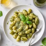 Serve your creamy pesto gnocchi in warmed shallow bowls to keep the sauce luscious and inviting. For a dinner party twist, offer individual portions with a drizzle of extra virgin olive oil and edible flower petals for a stunning presentation that feels special yet approachable.