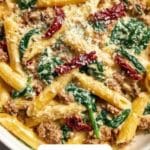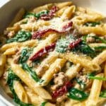 You can freeze this pasta, but since it’s cream-based, it’s best to freeze before adding the spinach and sun-dried tomatoes. Store the cooked sausage, sauce, and pasta separately in freezer-safe containers for up to 2 months. Thaw fully in the refrigerator before reheating and adding the fresh vegetables.