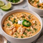 This Creamy White Chicken Chili is a comforting and hearty soup featuring tender chicken, creamy beans, and a blend of warming spices. Perfect for a cozy meal, it combines great northern beans, green chiles, corn, and a luscious mix of sour cream and cream cheese for a rich, smooth texture. Ready in just 40 minutes, this gluten-free American classic is ideal for family dinners or meal prepping.