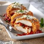 Spread about 1 to 2 tablespoons of marinara sauce over each seasoned chicken cutlet, letting the rich tomato flavor soak in. Next, sprinkle a generous handful of shredded mozzarella over the sauce. Carefully roll each cutlet up tightly, creating a snug, cheesy bundle. Use toothpicks to secure the rolls if needed, making sure they hold their shape through breading and baking.