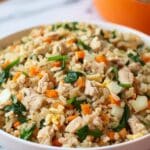 In a large bowl, mix together the shredded chicken, cooked rice, and softened vegetables. Drizzle with olive oil to add essential fats, and if you’re feeling adventurous, sprinkle a small amount of ground turmeric for a touch of flavor and health benefits. Stir everything thoroughly until well combined.