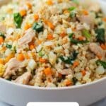 4. Combine ingredients: In a large mixing bowl, combine the shredded chicken, cooked rice, and the cooked vegetables.
