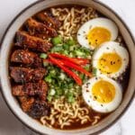 Yes! Swap the chicken for tofu or mushrooms, use vegetable broth, and replace heavy cream with coconut milk to keep things creamy and maintain the spicy, garlicky essence of this delicious ramen.