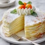 To make your Lemon Crepe Cake with Pistachios and Lemon Syrup Recipe truly irresistible, finish with a shower of chopped pistachios for crunch and color, fresh lemon slices for brightness, and a sprinkle of powdered sugar for that delicate snowy effect. Fresh mint leaves add a vibrant pop of green and a refreshing aroma to the senses.