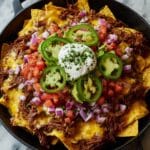Remove your nachos from the oven and immediately top them with chopped avocado, diced tomatoes, thin jalapeño slices, green onions, and fresh cilantro. These toppings add layers of freshness, creaminess, and a hint of spice that make every bite exciting.