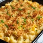 This Loaded Mac & Cheese Corn Casserole combines creamy, cheesy pasta with sweet corn, crispy bacon, and a buttery breadcrumb topping for a comforting, crowd-pleasing side dish or main course.