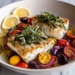 This Mediterranean Baked Fish Recipe pairs exceptionally well with crusty bread to soak up the delicious juices. For a heartier meal, fluffy couscous, quinoa, or a simple green salad with a light vinaigrette provide balance and complement the Mediterranean flavors beautifully.