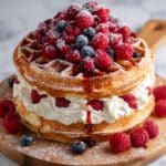 Spoon or pipe a generous dollop of your homemade whipped cream onto the surface of 8 of the toasted waffles. Then, top the cream with a few mixed fresh berries—think a few halved strawberries, plump blueberries, and juicy raspberries. Carefully place the remaining waffles on top to form little sandwich stacks. Press down just a bit to help everything stay together without squishing out the fluffy cream.
