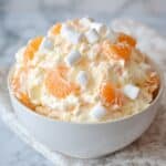 Orange Fluff Salad is a nostalgic, light and fluffy dessert perfect for gatherings. Made with orange gelatin, instant vanilla pudding, crushed pineapple, mandarin oranges, and mini marshmallows folded into whipped topping, this no-cook salad is a refreshing and sweet treat that sets to a creamy, airy texture.