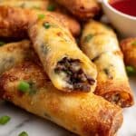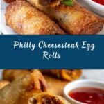 These Philly Cheesesteak Egg Rolls combine tender ribeye steak, sautéed vegetables, and melted provolone cheese wrapped in crispy fried egg roll wrappers for a delicious, game day-approved appetizer.