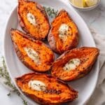 For a fun twist, slice the roasted sweet potatoes into thick cubes and toss them into a warm grain bowl or salad for a pop of sweetness and texture. You can also mash them with a bit of butter and garlic seasoning for a comforting side or stuff them with your favorite toppings like sautéed mushrooms or crumbled feta cheese.