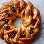 This Savory Turkey and Cranberry Crescent Ring is a delicious and festive recipe perfect for holiday gatherings or any cozy meal. Flaky crescent rolls are filled with a creamy chive and onion cream cheese spread, Dijon mustard, fresh herbs, shredded Gruyere cheese, thinly sliced turkey, and tangy whole berry cranberry sauce. Baked to golden perfection and topped with a buttery, garlicky poppy seed mixture, this impressive ring is both savory and slightly sweet, making it an irresistible appetizer or main dish.