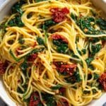 This creamy and flavorful Spaghetti and Spinach with Sun-Dried Tomato Cream Sauce offers a delicious Italian-inspired vegetarian main course. Featuring tender spaghetti tossed in a rich sun-dried tomato and Parmesan cream sauce, enhanced with fresh baby spinach and a hint of red pepper flakes for subtle heat, this dish is perfect for an easy weeknight dinner or a satisfying meatless meal.