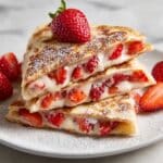 A delightful and easy-to-make Strawberry Cheesecake Quesadilla featuring creamy vanilla-infused cream cheese and fresh strawberries sandwiched between golden, buttery tortillas. Perfect as a quick dessert or sweet snack.