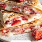 Let the quesadillas cool just a little before slicing into wedges. A sprinkle of powdered sugar on top adds a pretty final touch and a hint of extra sweetness that makes this Strawberry Cheesecake Quesadilla Recipe impossible to resist.