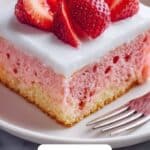 Place one of the cooled cake layers on your serving plate and spread half of the strawberry cloud filling evenly over the top. Then, set the second cake layer on top and spread the remaining filling over the top and sides of the cake. Don’t hold back; this creamy strawberry filling is the heart of the cake! For a beautiful finishing touch, garnish with extra whipped topping or additional strawberries as desired. Chill the assembled cake for at least an hour to let everything set and meld.