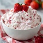 Strawberry Fluff Salad is a creamy, fruity no-bake dessert perfect for potlucks and family gatherings. This light and refreshing salad combines instant vanilla pudding, whipped topping, mini marshmallows, strawberry pie filling, and fresh strawberries to create a sweet treat with a delightful fluffy texture. Optional nuts add a nice crunch.