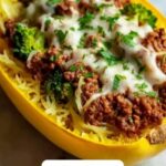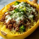 This Stuffed Spaghetti Squash recipe combines tender roasted spaghetti squash halves filled with a flavorful mixture of ground beef, fresh broccoli, and melted mozzarella cheese. It’s a wholesome, comforting dish perfect for a nutritious family dinner, featuring savory Italian seasoning and a hint of garlic and onion for depth of flavor.