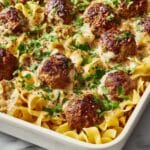 This Swedish Meatball Noodle Bake is a comforting and hearty casserole featuring tender homemade meatballs in a creamy sauce, layered over egg noodles and topped with melted Swiss cheese. Perfect for a family dinner, it combines classic Swedish flavors with easy oven-baking for a satisfying meal in under an hour.