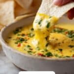 Remove your queso from the heat and stir in chopped fresh cilantro if you like that lovely herbal brightness. Now your dip is ready to serve warm with crunchy tortilla chips for the ultimate snack experience.