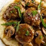 Return the meatballs to the skillet, nestling them gently into the mushroom gravy. Cover and simmer for 10 to 12 minutes until the meatballs are cooked through and the sauce has thickened to luscious perfection. Taste and adjust seasoning with salt and pepper as needed.