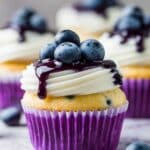Yes! Frozen blueberries can be used, especially for the sauce. Just thaw and drain them beforehand to avoid excess moisture that could affect the texture of the cupcakes.