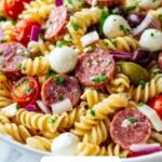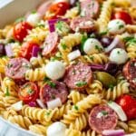 A flavorful and vibrant Zesty Italian Pasta Salad featuring rotini pasta tossed with a homemade Italian dressing, fresh vegetables, cured meats, and mozzarella pearls. Perfectly chilled to meld the zesty flavors, this salad makes a refreshing and hearty dish for gatherings or meal prep.